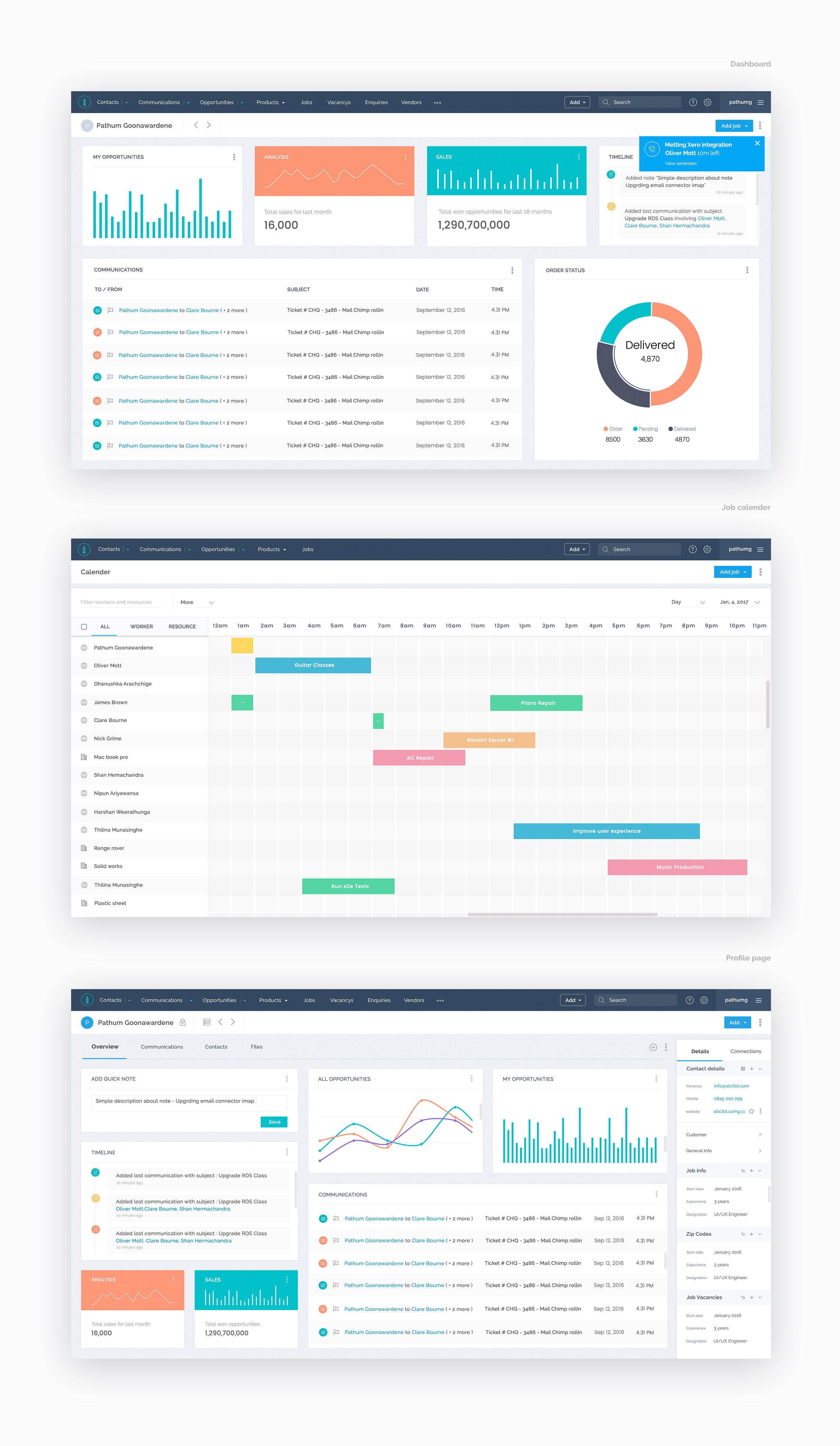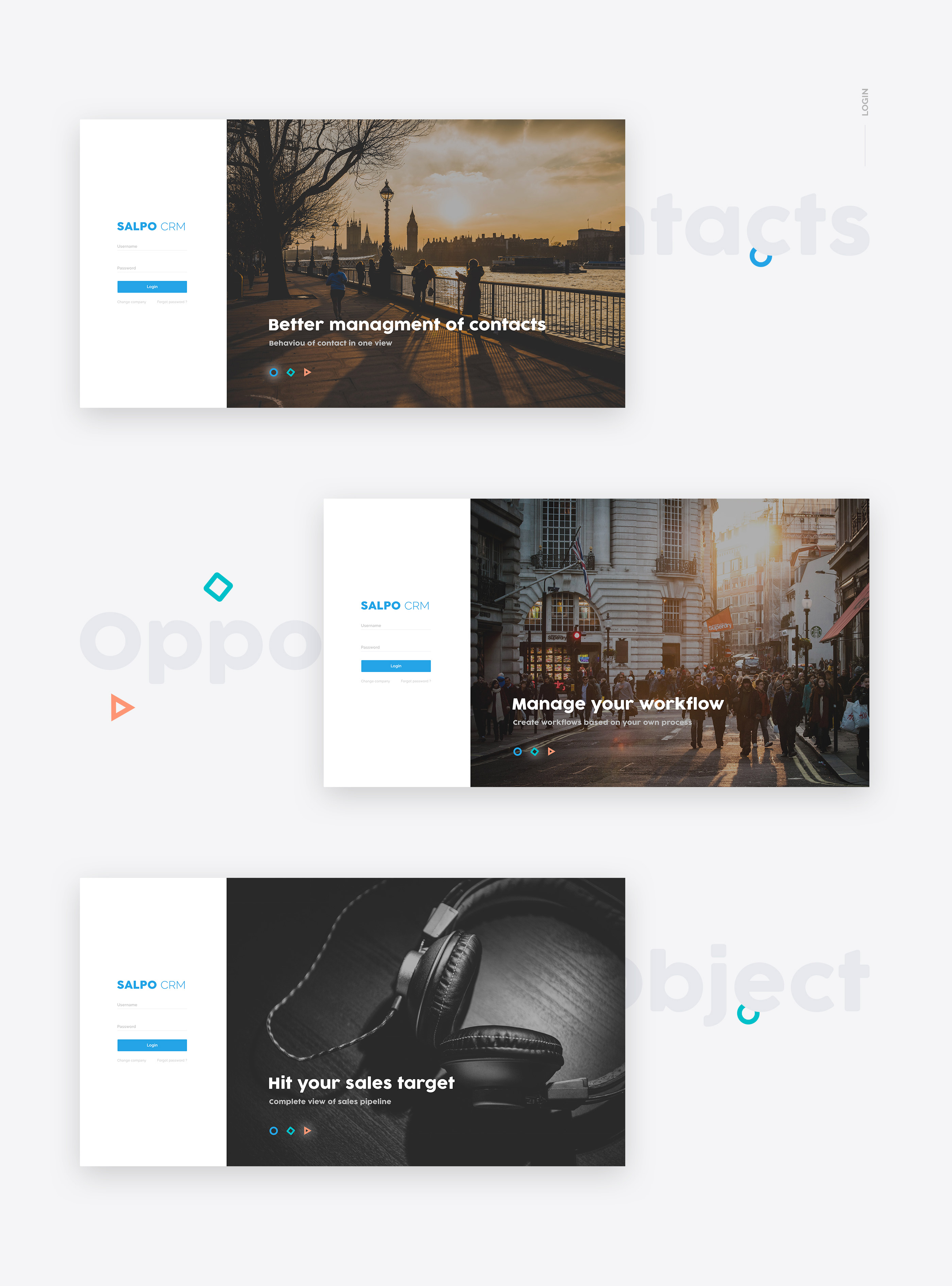 Salpo CRM - Used brighter texts for the interfaces. Overall it looks cool but very calm. Thoughtfully managed the use of shadows, white space, and highlight colors.